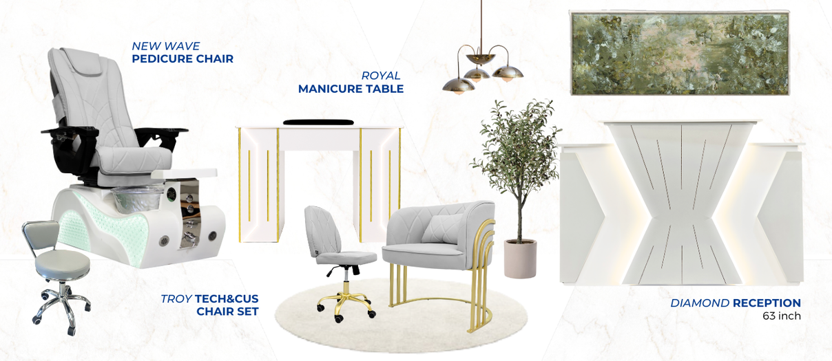 COMBO 6-PIECE SET – Free Shipping + Gifts | New Wave Pedicure Chair (White Base) – Royal Nail Table, Troy Armchair Set