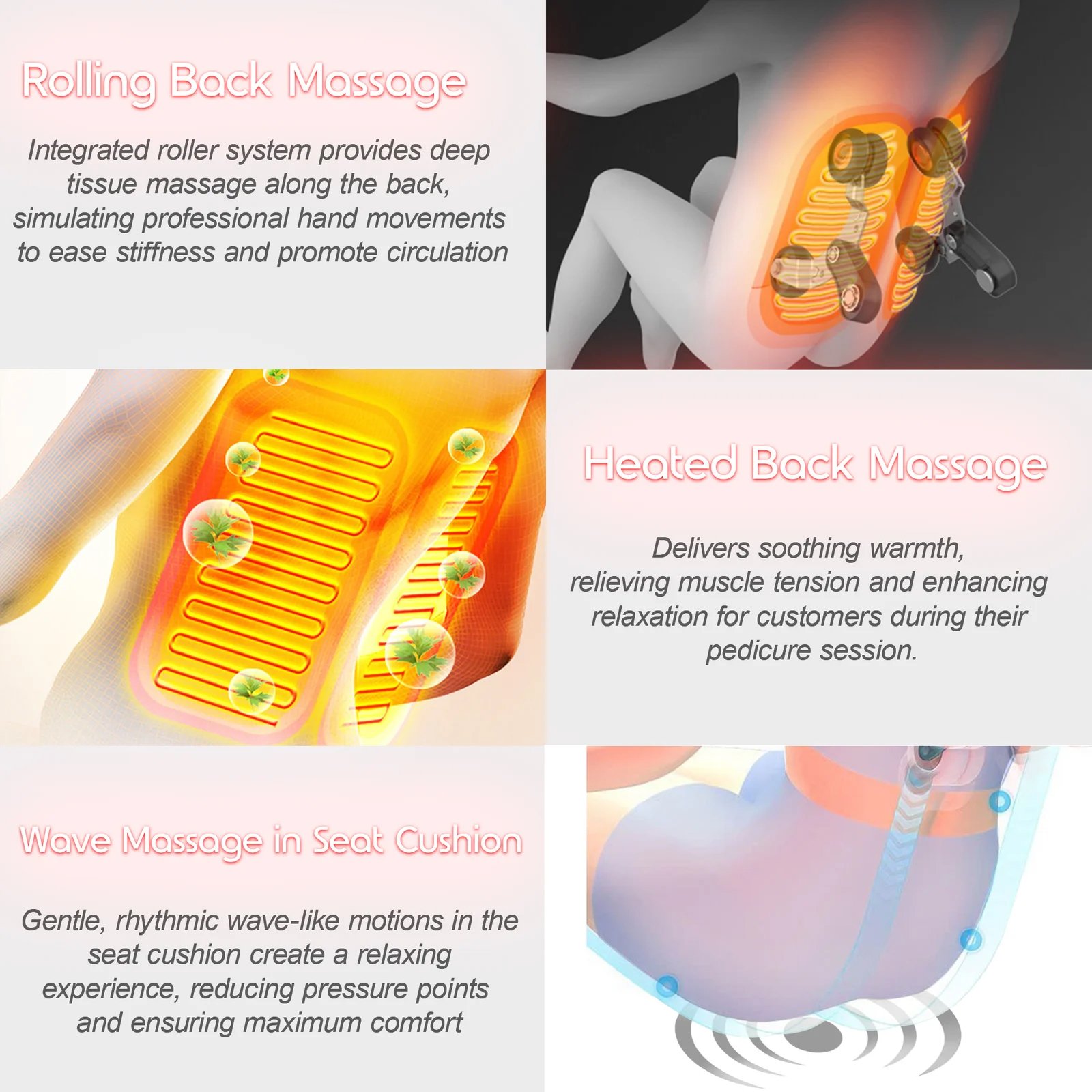 Upgrade your salon with the New Wave Pedicure Chair, a professional-grade spa chair designed with massage, heat, acetone-resistant leather, and a durable black base. Perfect for nail salons looking for comfort, efficiency, and modern style. This pedicure spa chair combines luxury seating, advanced features, and ETL/UL safety certification, making it the top choice for salon owners across the U.S.