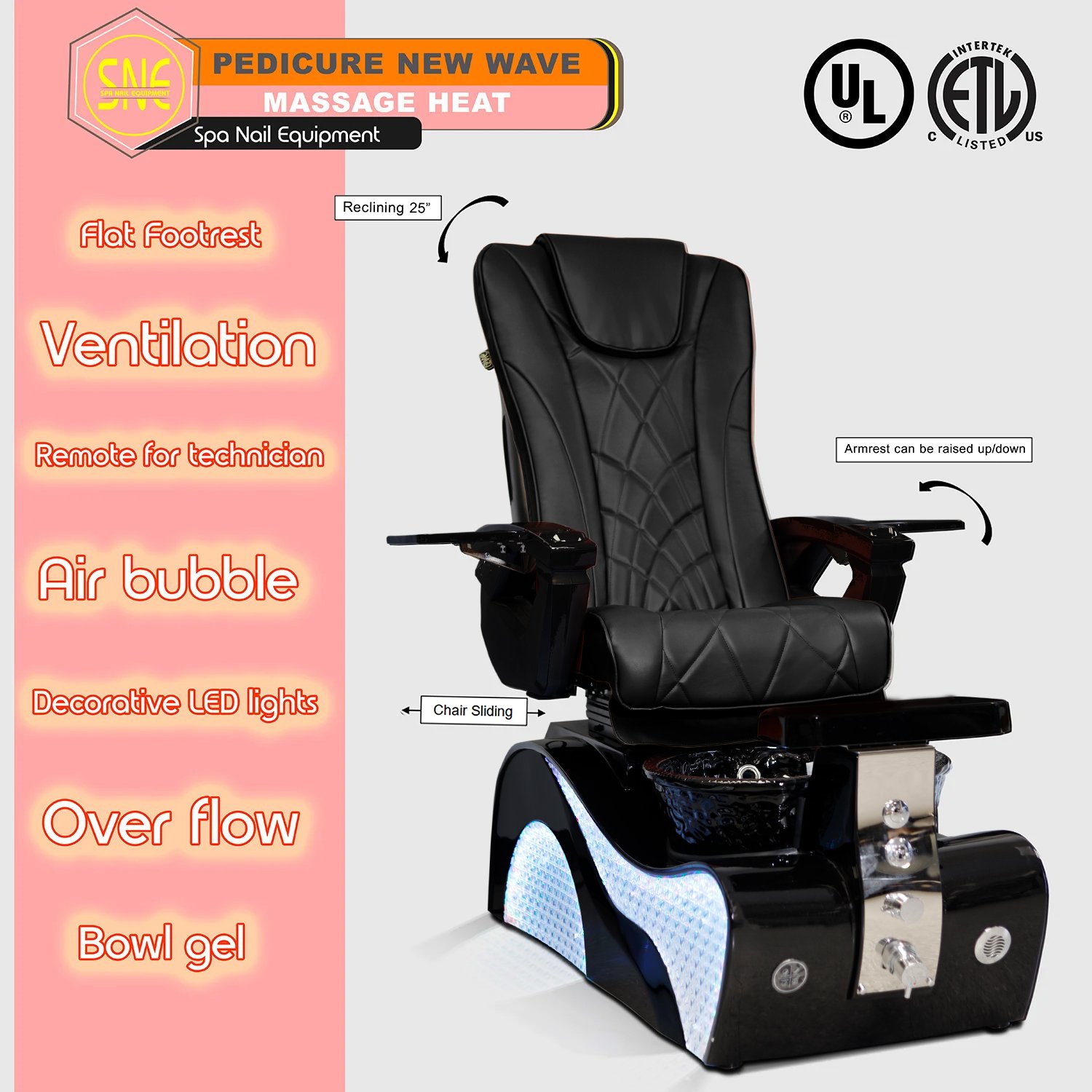 The pedicure base is equipped with an air bubble system, soft fiber footrest (perfect for UV/LED lamp placement), odor-eliminating ventilation, temperature control, and a crack-resistant gel bowl with LED lighting, creating a clean and luxurious spa environment.