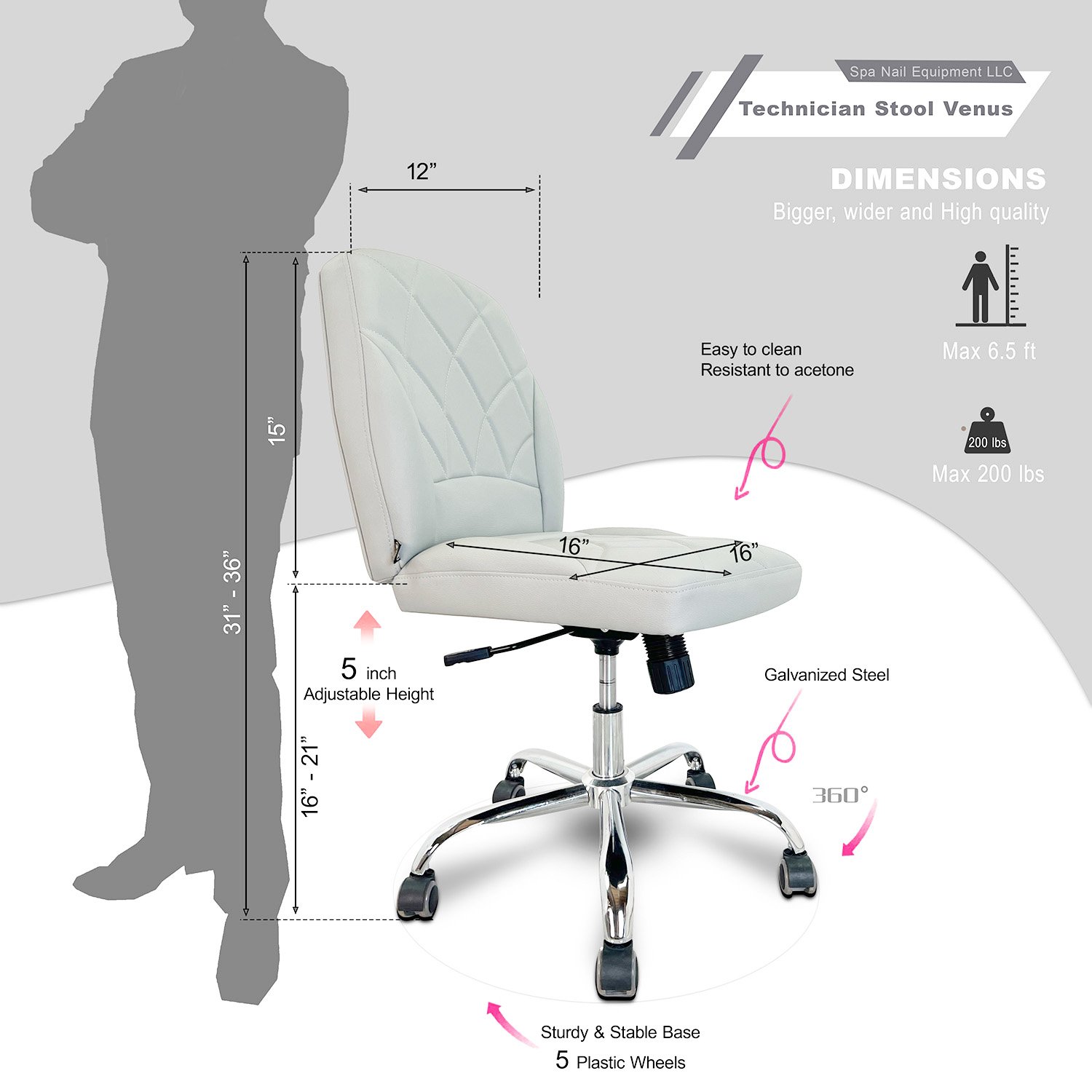Technician Stool Dimensions: 16”W x 16”L | Height: 31”–36”H | Weight: 20 lbs