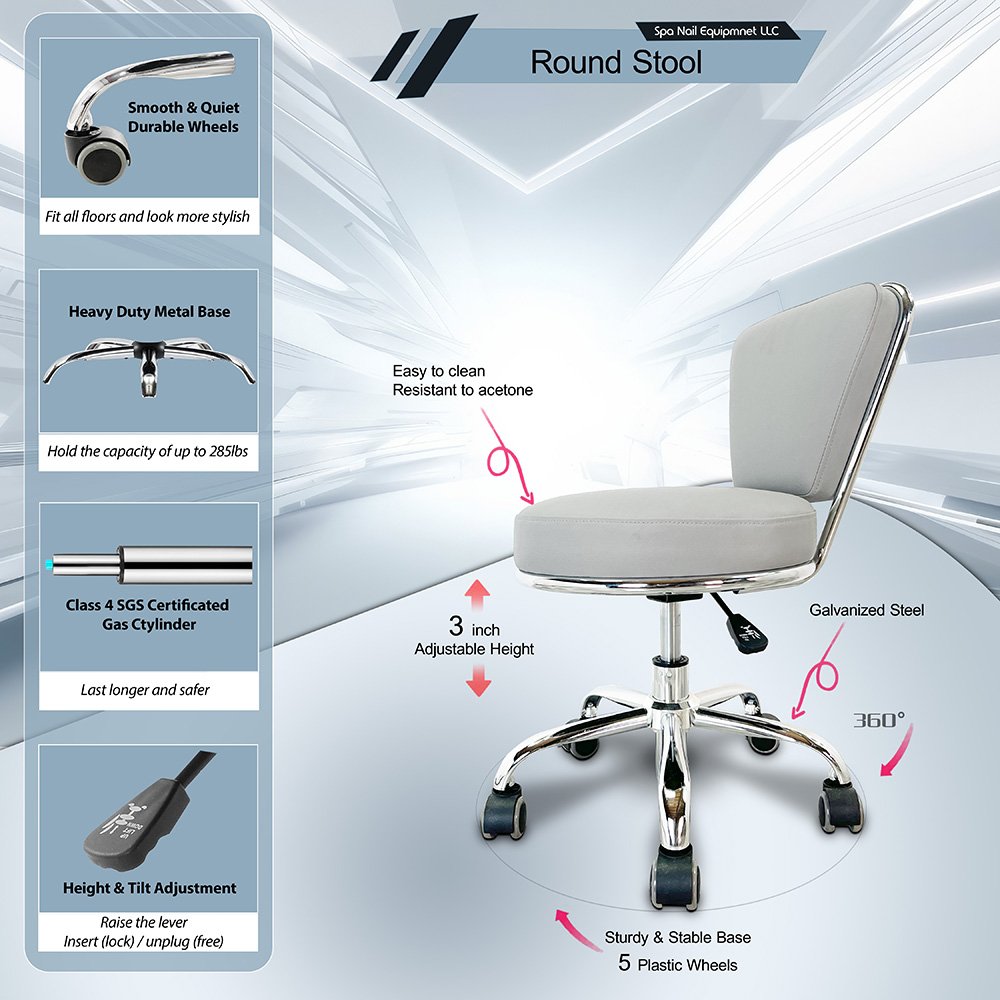 Both chairs are acetone-resistant, built on a sturdy frame (300 lbs. capacity for customer chair, 200 lbs. for stool), and come in 5 stylish colors to complement any salon decor.