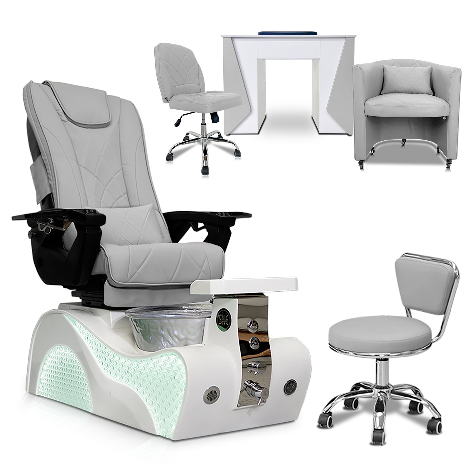 Upgrade your nail salon with this all-in-one luxury nail salon furniture set. The package includes the NEW WAVE Pedicure Spa Chair, a Nail Table, and the VENUS Technician & Customer Chair Set.