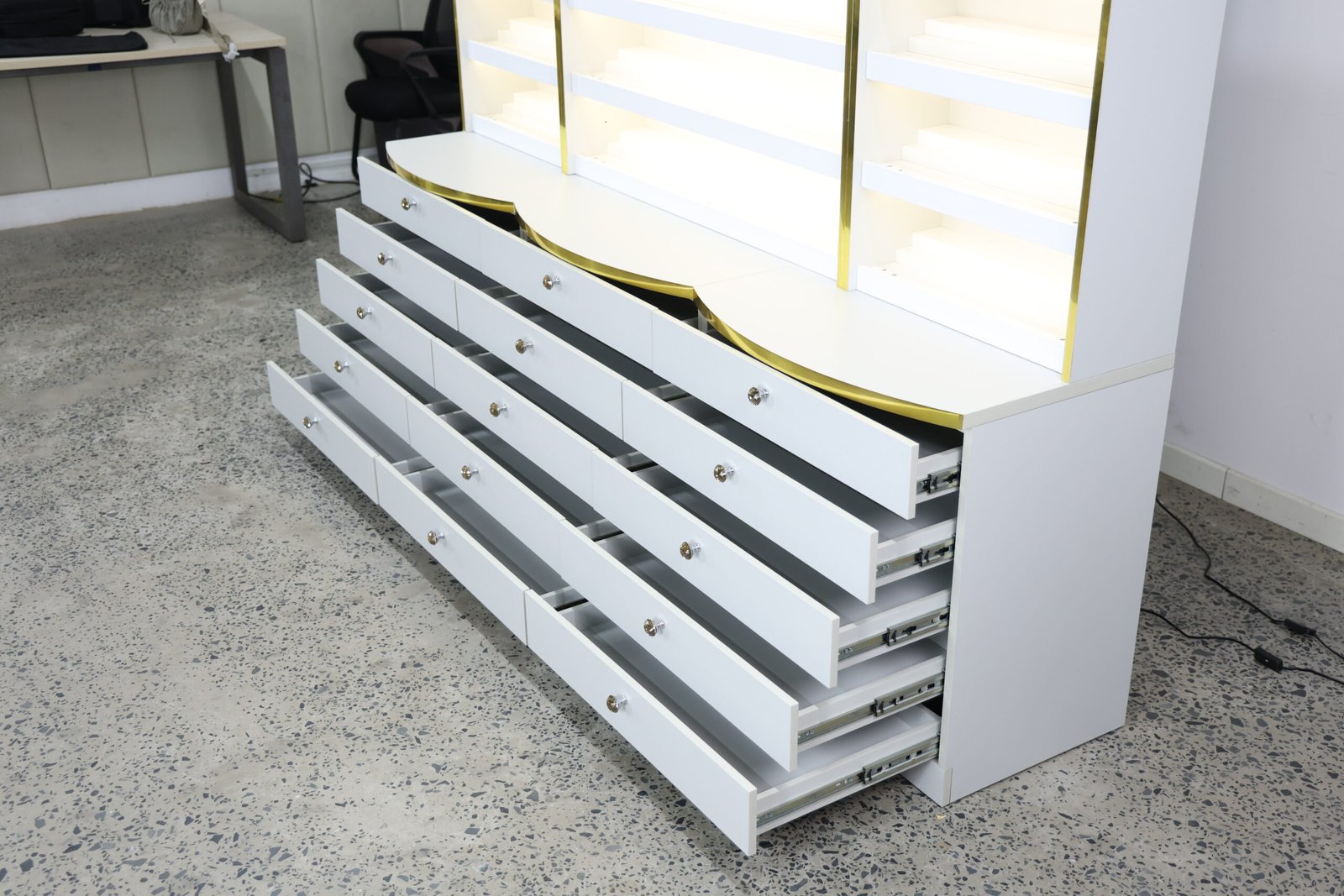 7 Designer Shelves with Integrated LEDs: The cabinet features 7 dedicated shelves, each divided into 3 levels for easy access. What sets the Royal Line apart is the integrated LED lighting on every shelf—transforming your collection into a glowing display of colors that captivates every client.