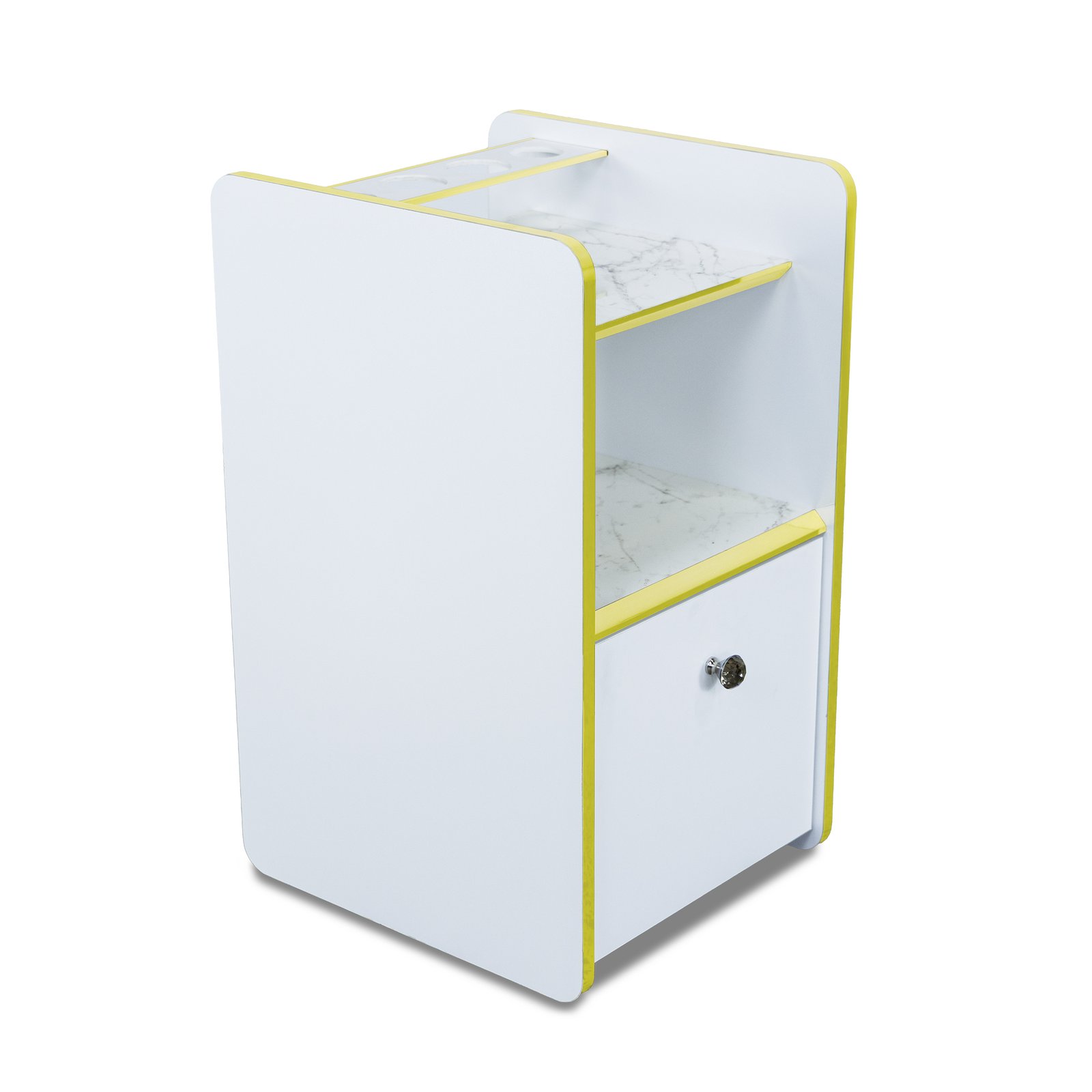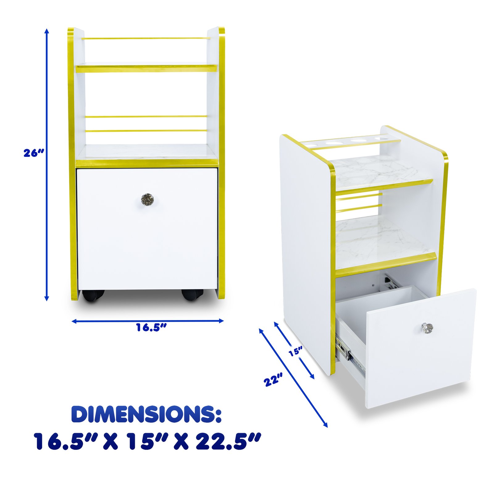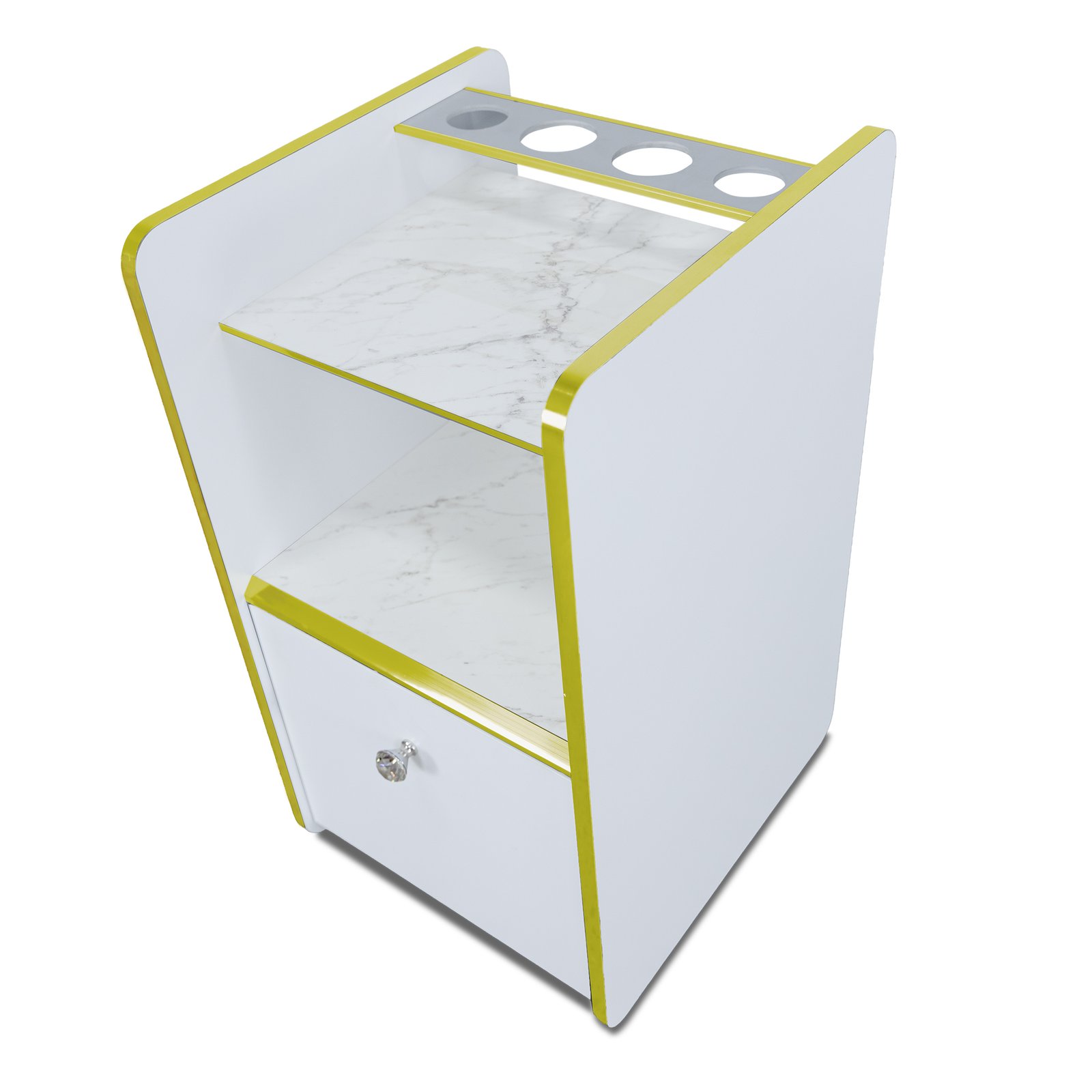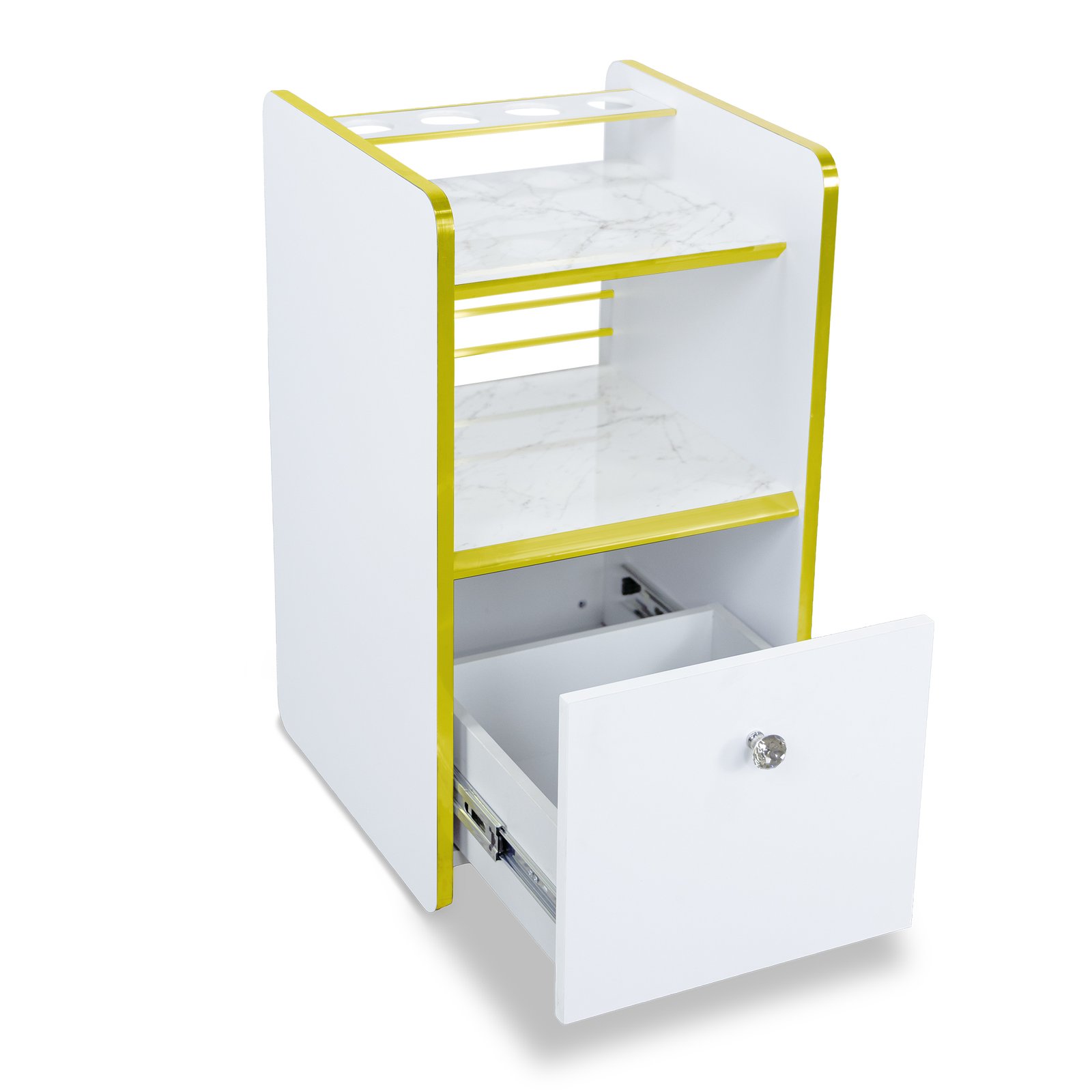 - 1.0.1 Crafted for salons that demand the best, the Pedi Cart features a high-gloss finish elevated by sophisticated gold-trimmed lines. This subtle yet striking detail brings a “Royal” feel to your workspace.